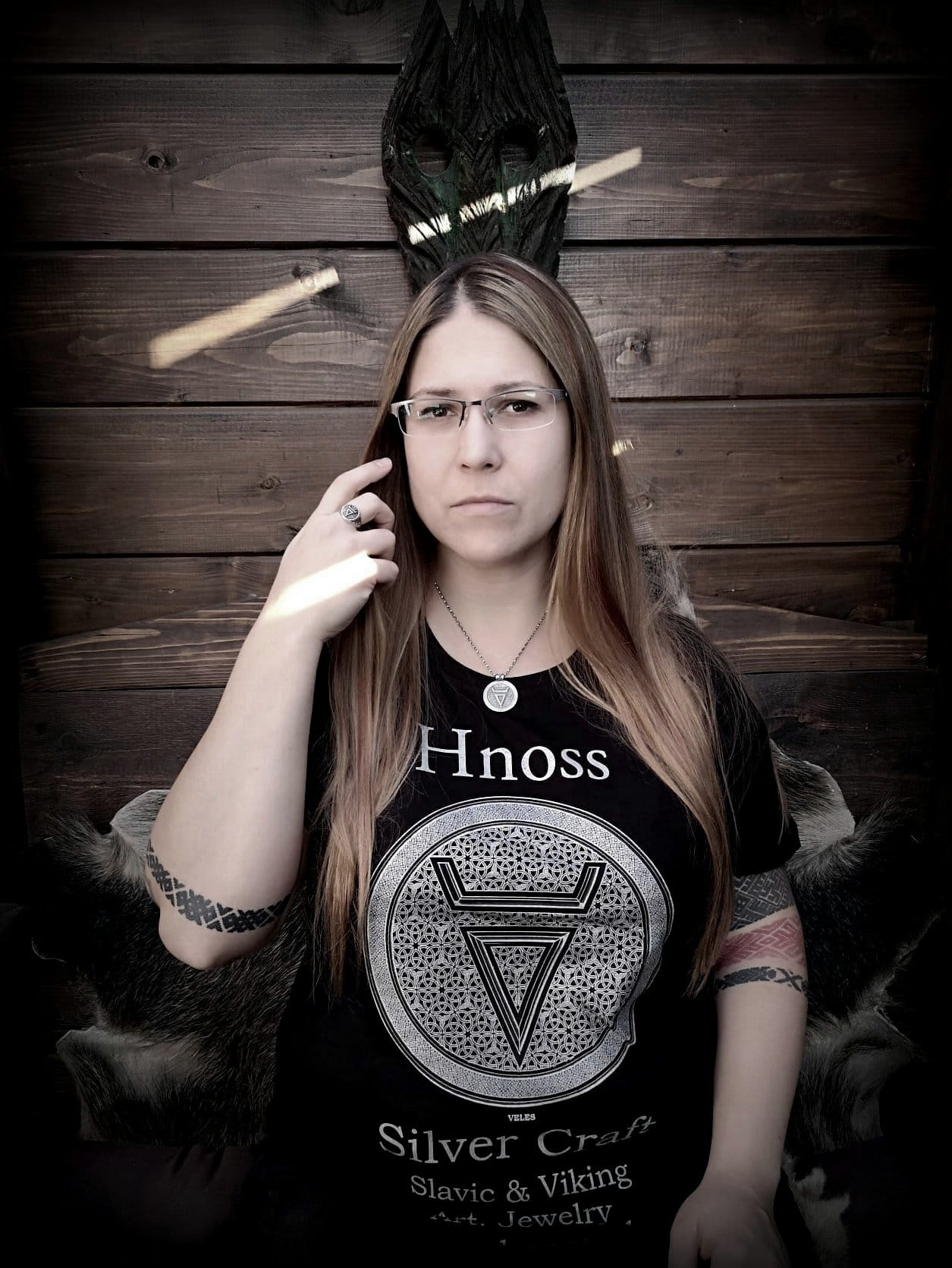 Koszulka czarna damska XL ze srebrnym nadrukiem symbolu Welesa Słowiańskiego Boga strzegącego podziemnych zaświatów zwanych "Nawią"